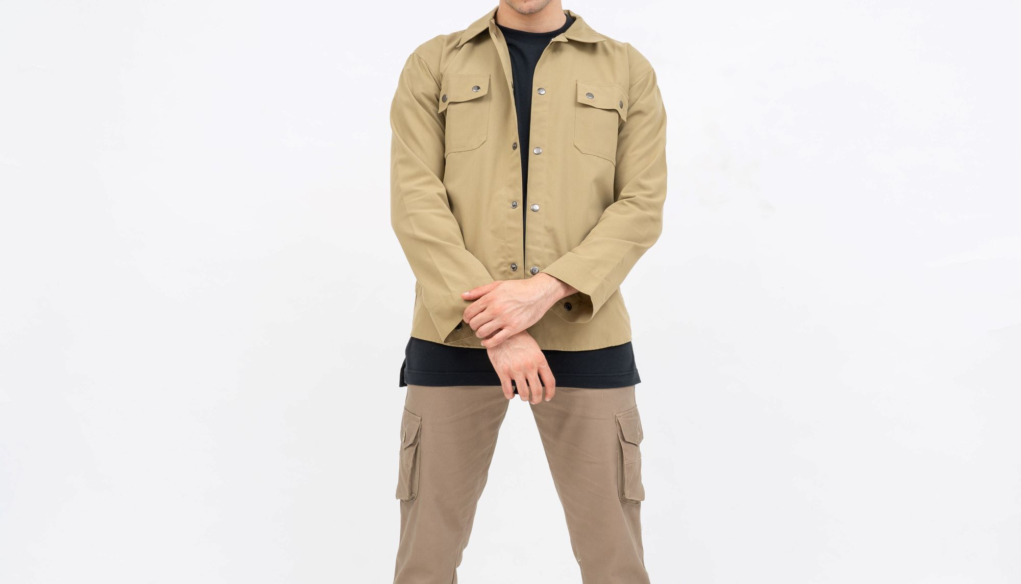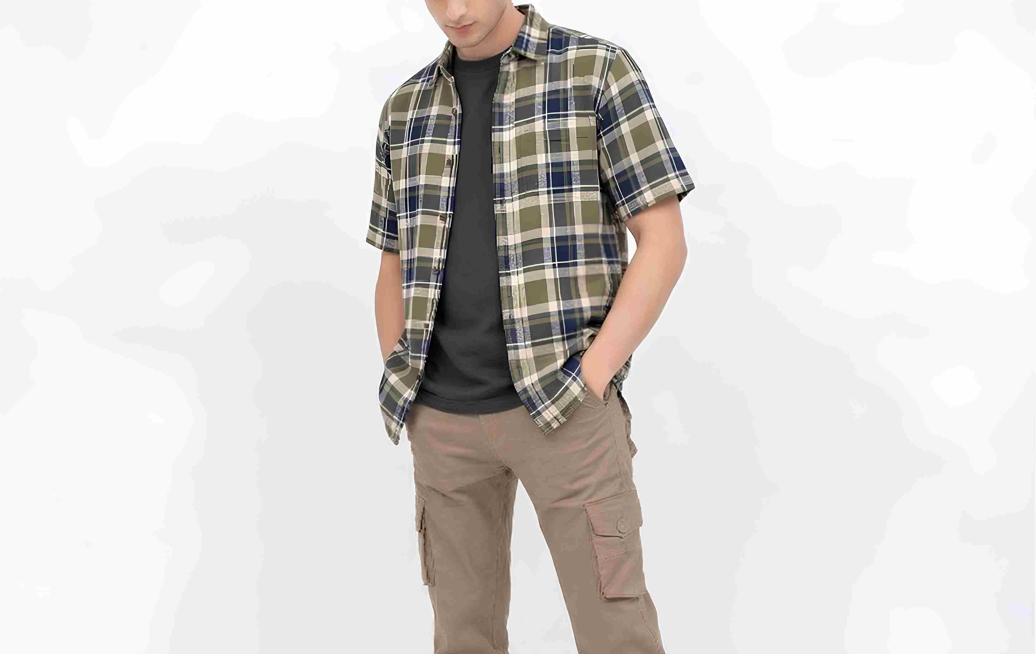 Kemeja casual polos juga bisa menjadi pilihan jika ingin menaikkan level outfit. Kombinasi cargo dengan kemeja memberikan keseimbangan antara rugged dan clean look sehingga tampilan terlihat lebih matang.