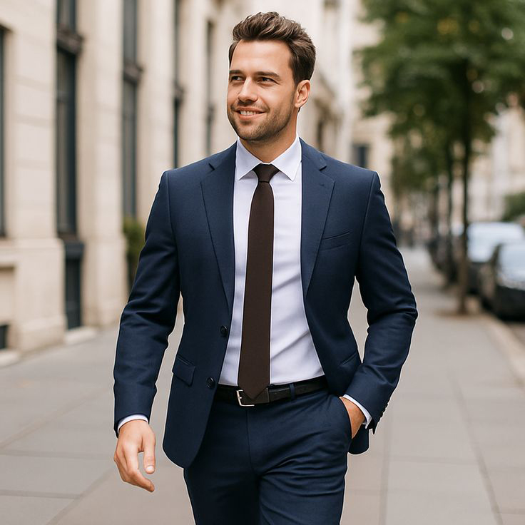 Dasi coklat menjadi pilihan menarik untuk tampilan yang lebih hangat dan dewasa saat dipadukan dengan jas navy. Kombinasi ini cocok untuk pria yang ingin tampil elegan tanpa terlihat terlalu formal.