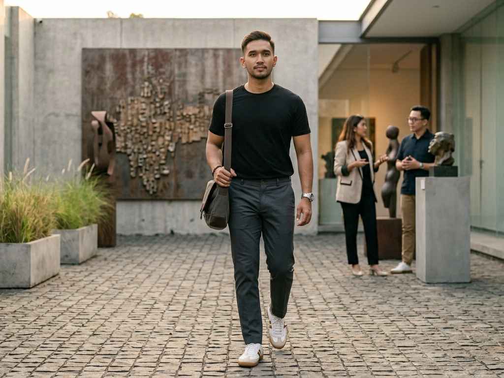 Chino hitam menawarkan kesan paling tegas dan minimalis. Kombinasi dengan atasan putih tulang atau abu-abu terang menciptakan tampilan monokrom yang terlihat lebih mahal. Warna ini juga cocok untuk gaya pria yang ingin tampil simpel namun tetap berkarakter.