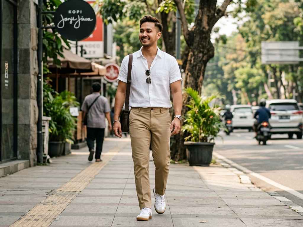 Celana chino warna khaki sering menjadi pilihan paling aman karena dapat dipadukan dengan hampir semua warna atasan. Atasan putih atau biru muda menciptakan tampilan yang bersih dan fresh, sementara warna navy memberikan kontras yang lebih tegas.