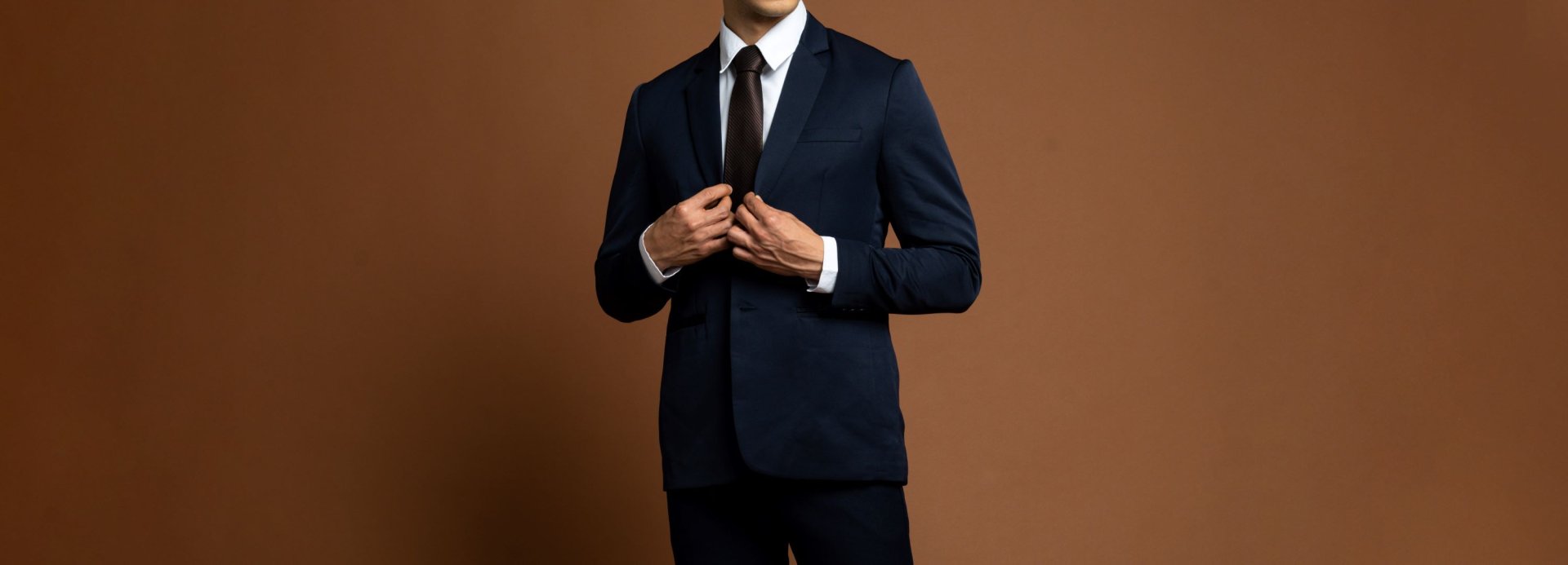 Warna navy, abu, atau hitam selalu aman. Gunakan dasi polos slim untuk kesan profesional.