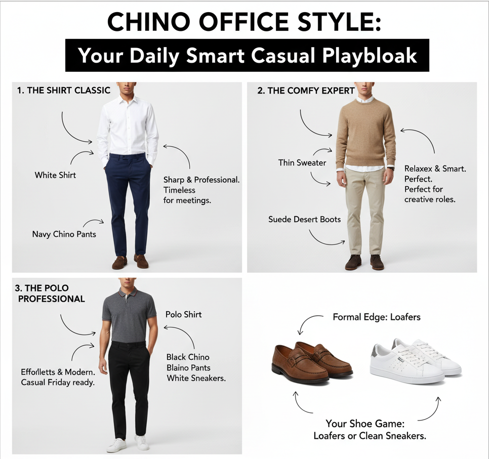 - Chino Beige + Sweater Tipis: casual elegan untuk suasana kerja santai.