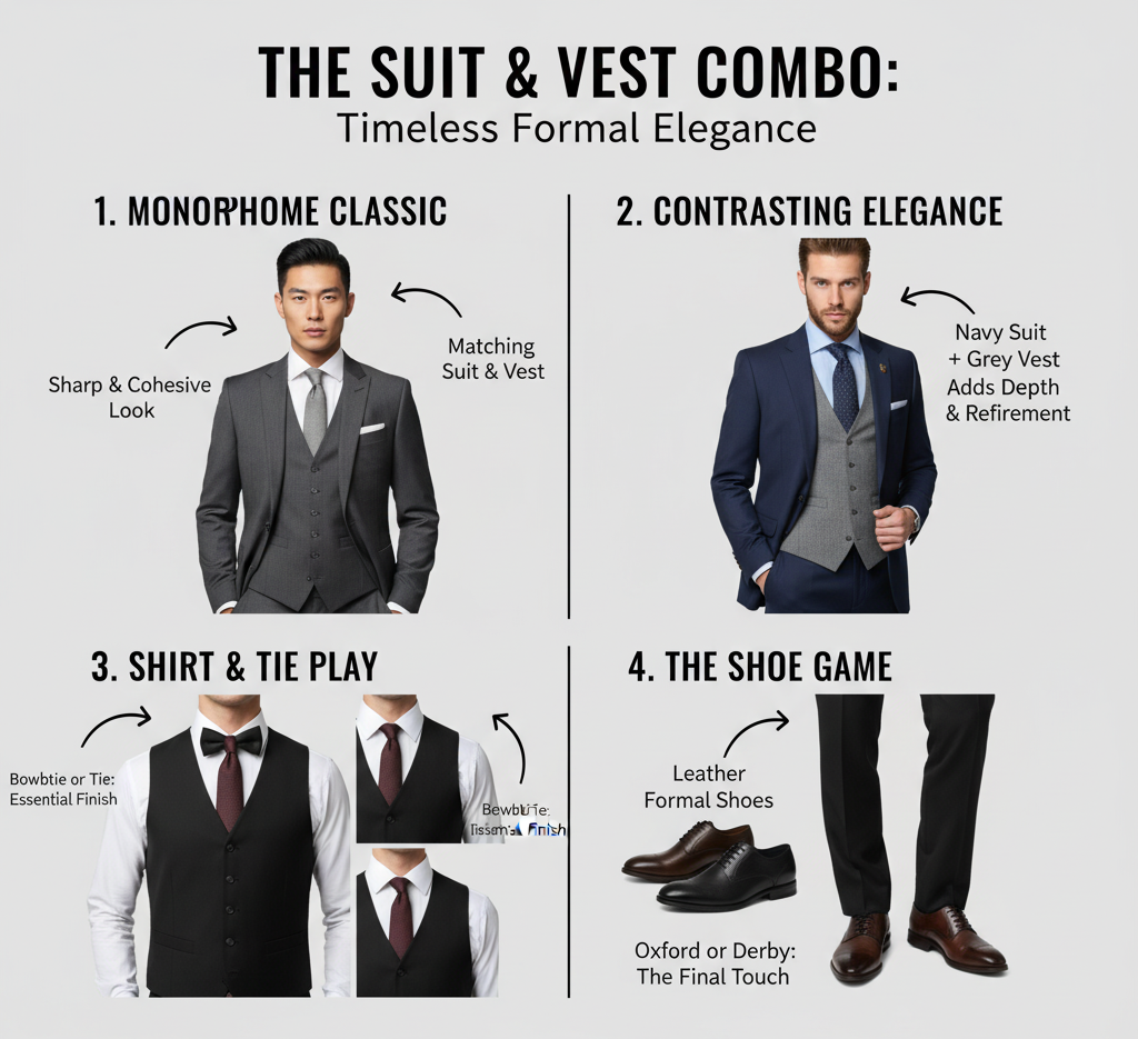 Jas dan vest adalah kombinasi formal yang tidak pernah gagal untuk menciptakan penampilan klasik. Paduan ini membuat pria terlihat lebih rapi, berkelas, dan penuh percaya diri.