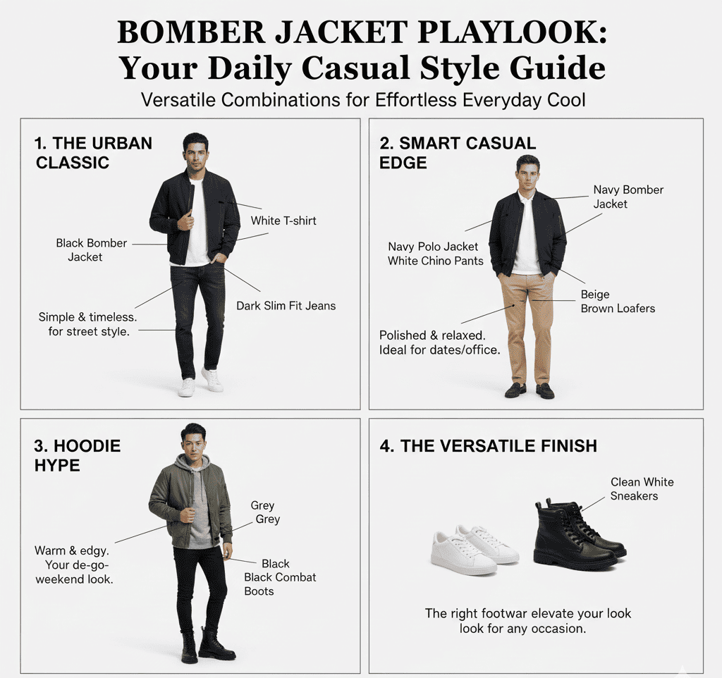 Jaket bomber adalah outerwear versatile yang cocok untuk daily casual look. Beberapa inspirasi paduan: