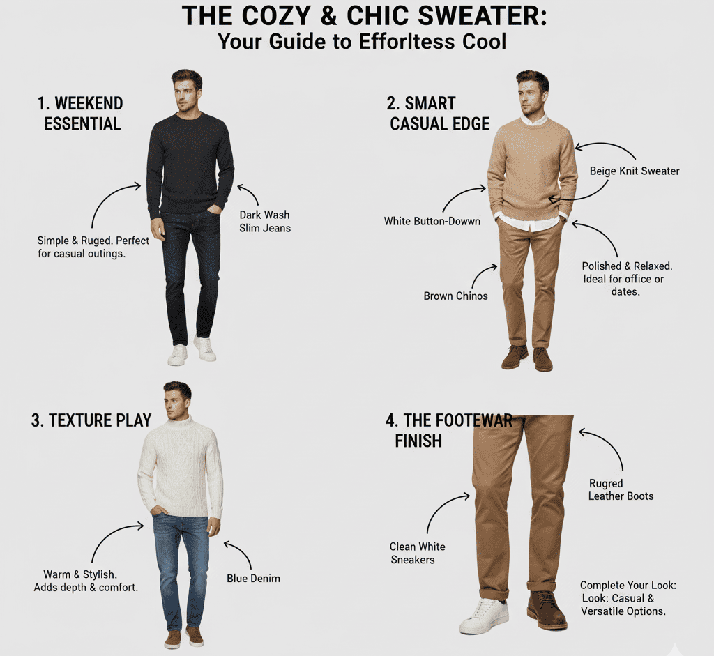 Sweater adalah pilihan tepat untuk tampil casual tapi tetap modis. Beberapa kombinasi yang bisa dicoba: