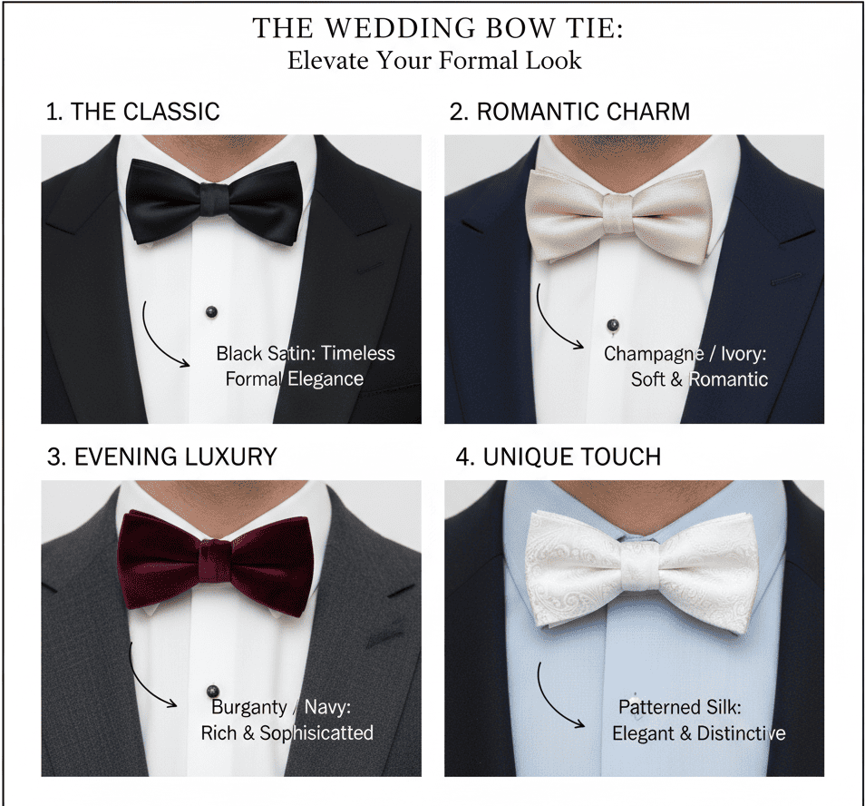 - Bow tie warna champagne atau ivory: memberi kesan lembut dan romantis.