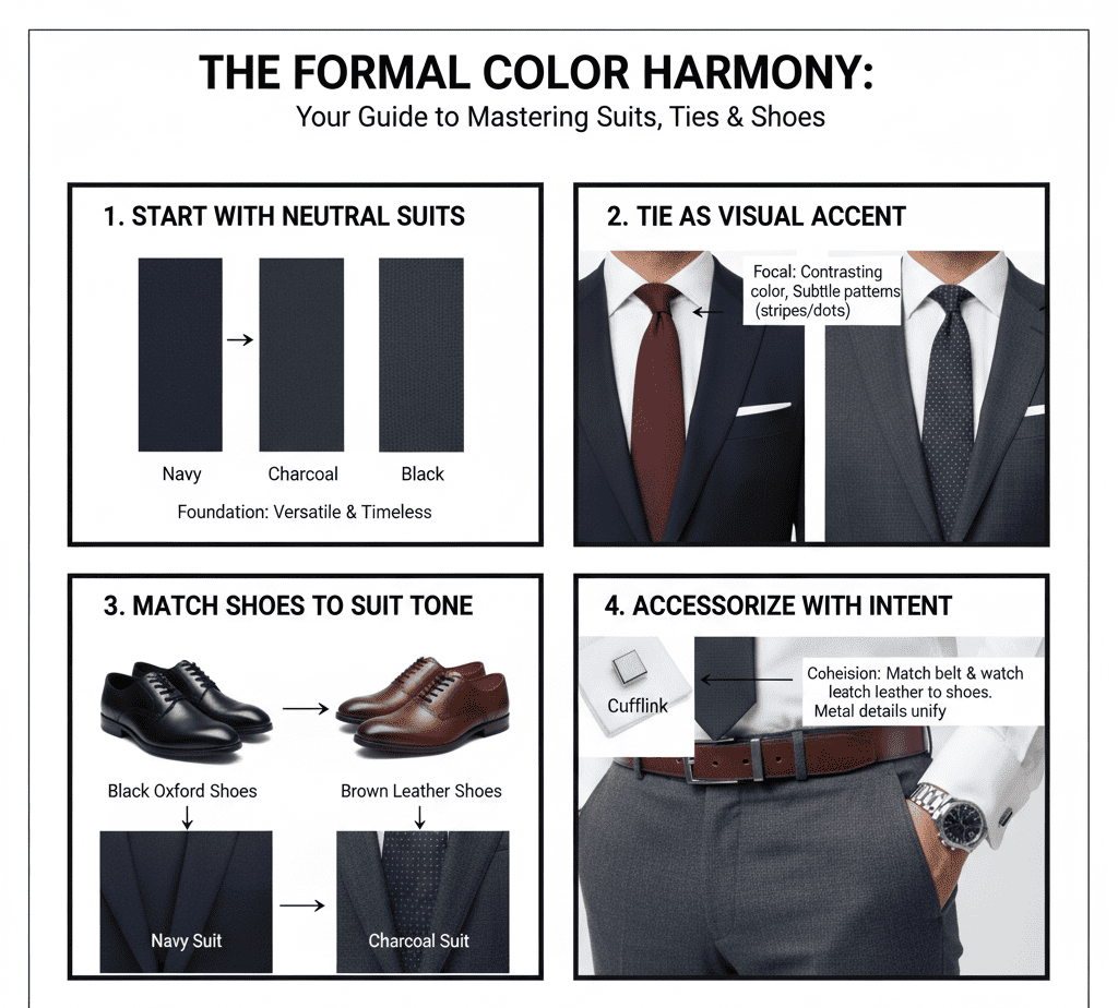 Warna memiliki peran besar dalam menciptakan kesan pertama. Dalam gaya formal pria, kesalahan kecil dalam perpaduan warna bisa membuat tampilan terlihat tidak proporsional. Berikut panduan aman untuk menjaga keseimbangan warna antara jas, dasi, dan sepatu:
