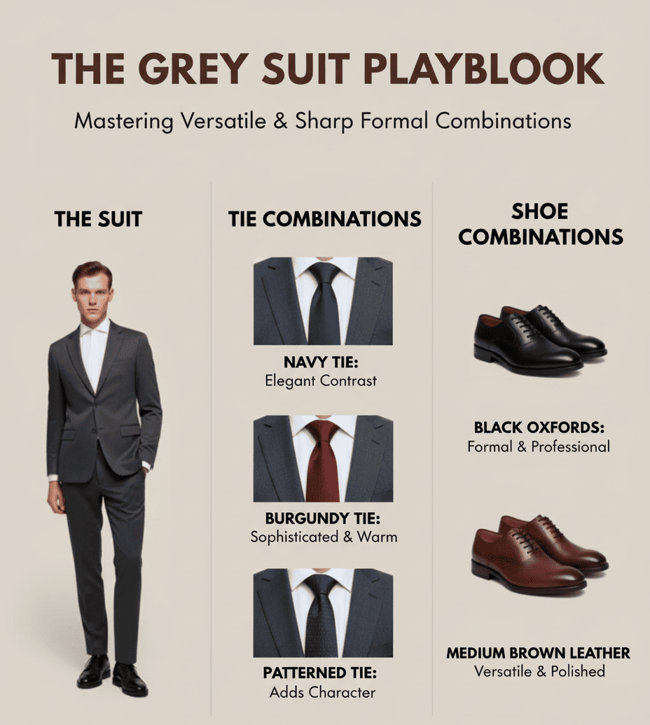 Jas abu-abu adalah pilihan aman untuk berbagai acara formal karena mudah dipadukan. Agar tampil maksimal, berikut kombinasi sepatu dan dasi yang bisa kamu coba: