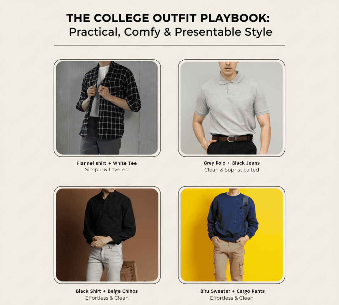 Outfit kuliah harus praktis, nyaman, dan tetap terlihat presentable. Beberapa kombinasi yang bisa dicoba: