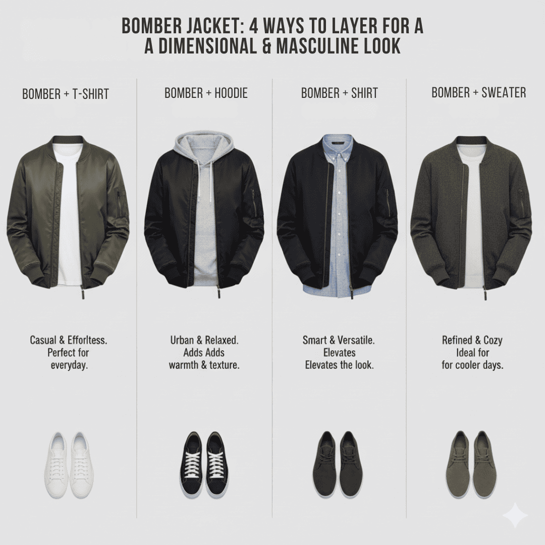 Layering dengan bomber memberi kesan modern tanpa harus memakai banyak item.