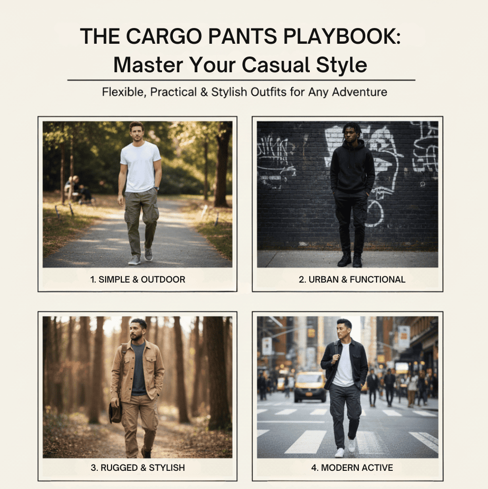 - Cargo + Overshirt: tampilan santai modern untuk aktivitas aktif sepanjang hari.