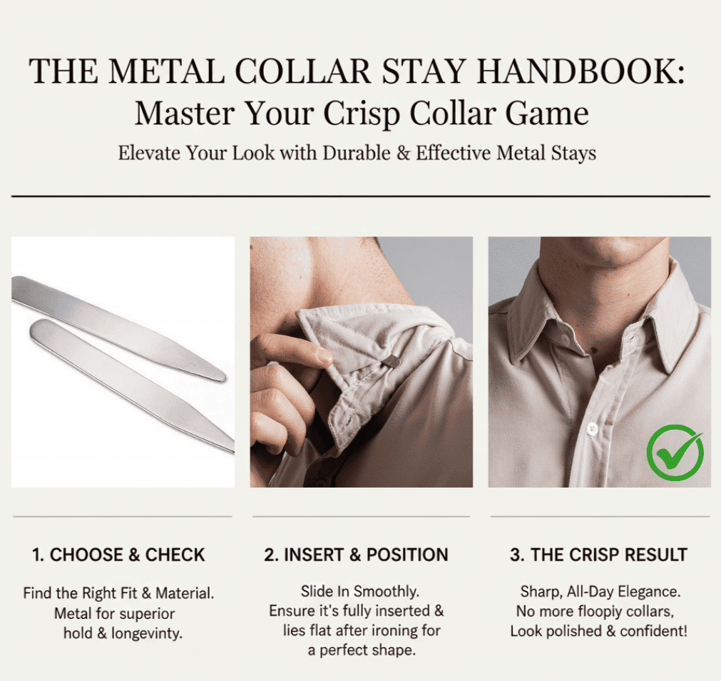 Kerah kemeja yang lemas bisa merusak keseluruhan tampilan formal. Collar stay membantu menjaga bentuk kerah agar tetap tegak dan clean sepanjang hari.