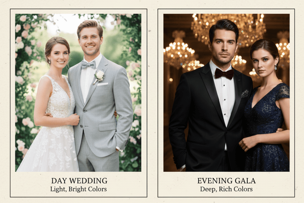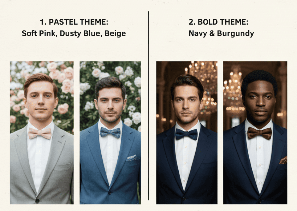 Jika wedding bertema pastel, pilih bow tie soft pink, dusty blue, atau beige. Untuk tema bold, navy atau burgundy bisa jadi pilihan aman.