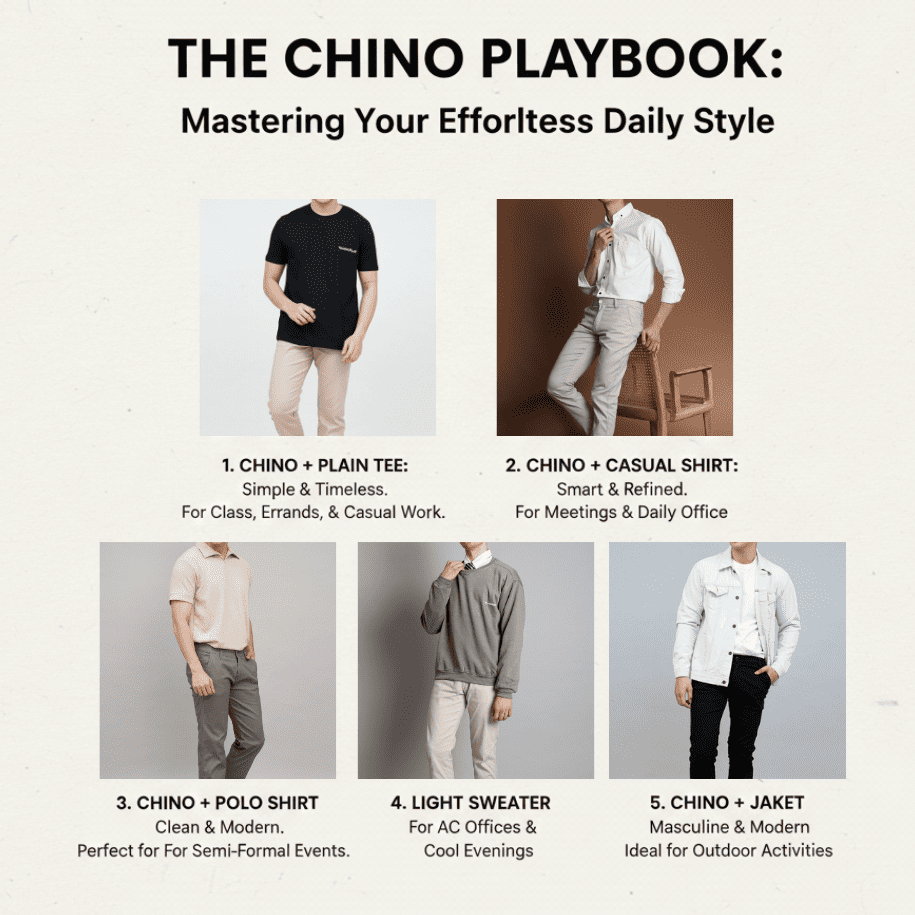 - Chino + Jaket: membuat gaya lebih maskulin dan modern, ideal untuk aktivitas outdoor ringan.