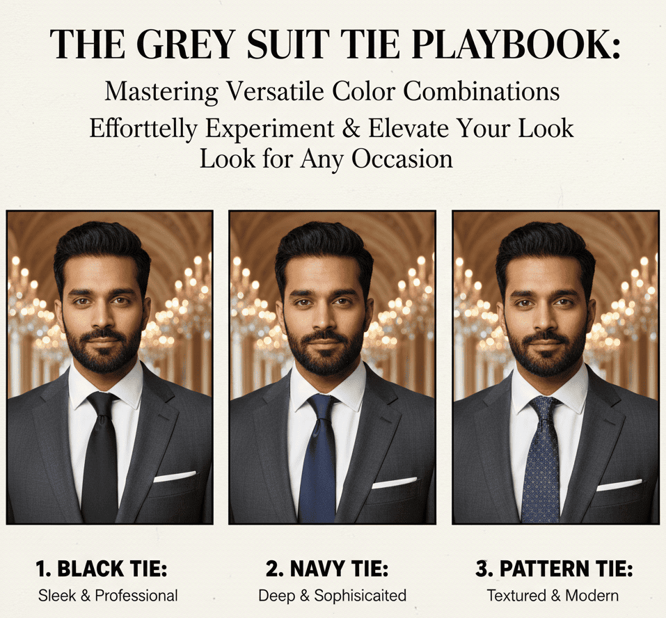 3. Jas Grey + Dasi Hitam, Biru Tua, atau Pattern Halus