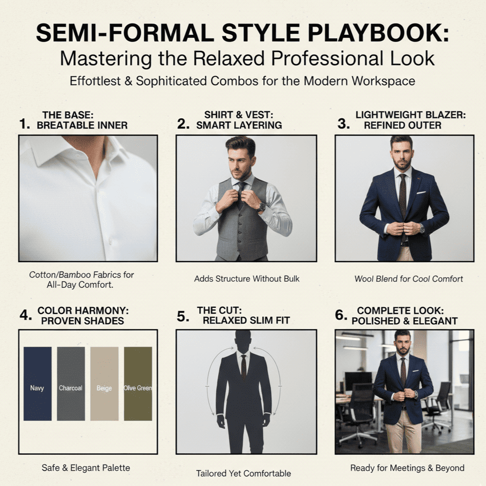 Gaya formal semi-kasual adalah solusi pas buat kamu yang ingin tampil rapi tanpa terlihat kaku. Kuncinya ada pada pemilihan item yang simpel, ringan, dan tetap memberi kesan profesional. Berikut panduan yang bisa kamu ikuti: