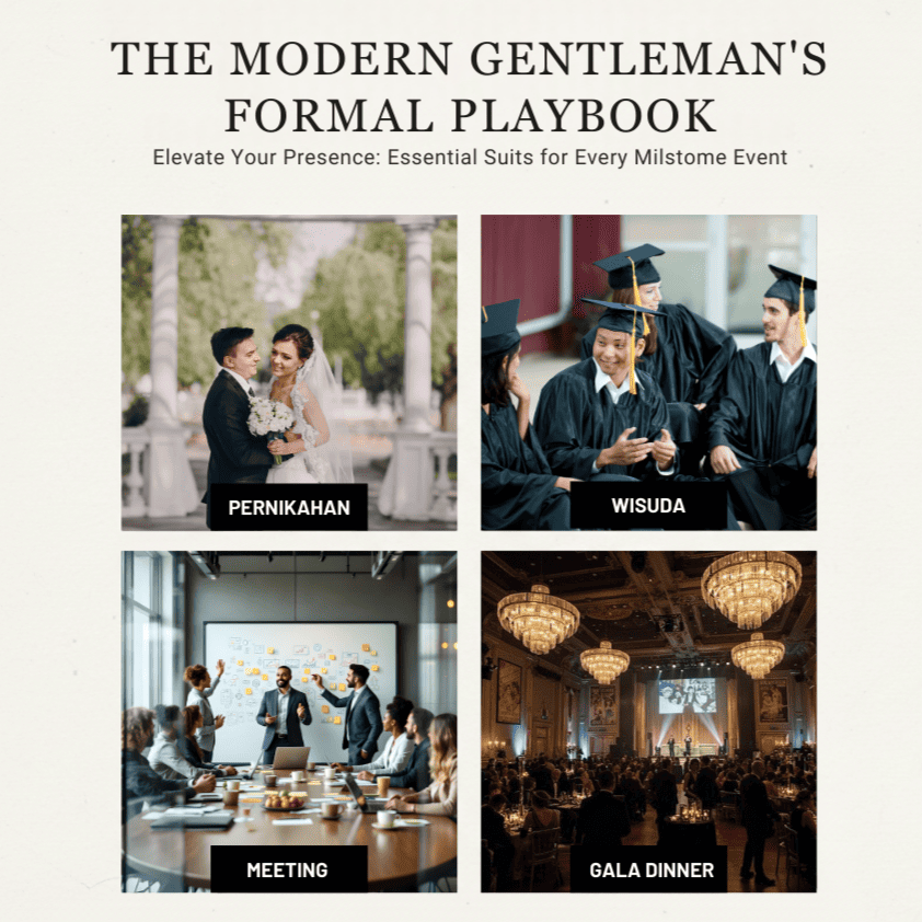- Aksesoris Pendukung: Tersedia dasi, bow tie, rompi, pocket square, cufflinks hingga sepatu formal.