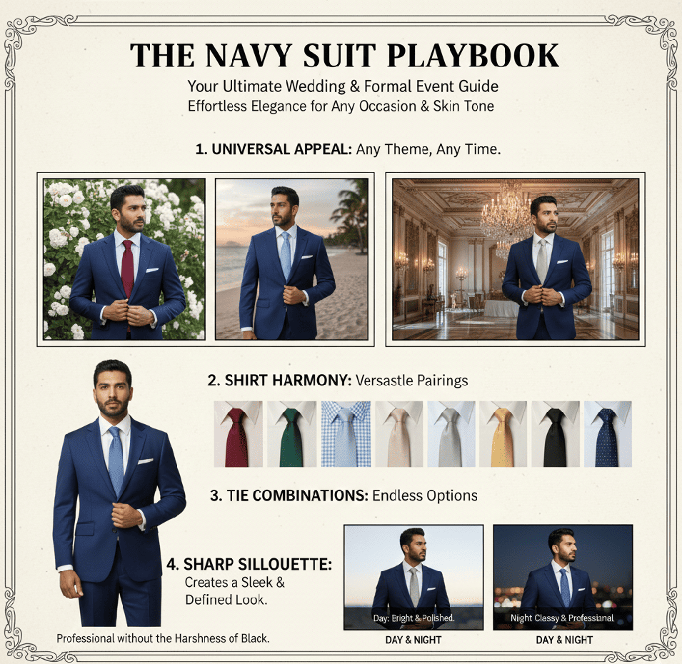 Navy sangat fleksibel untuk kombinasi dasi burgundy, silver, gold, black, emerald, hingga motif subtle semuanya terlihat elegan. - Memberikan Siluet Lebih Tegas