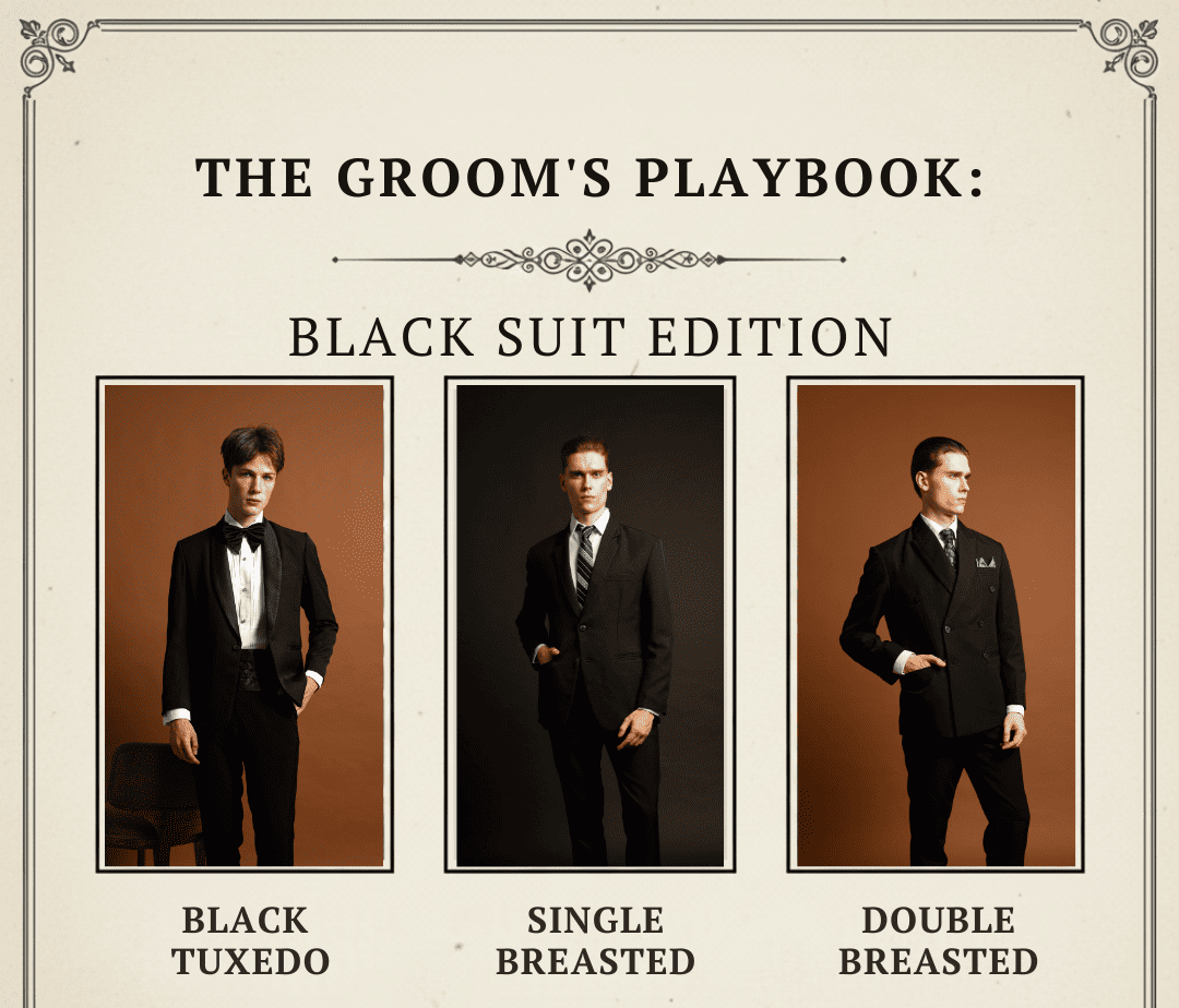 Untuk wedding malam atau venue mewah, black suit adalah pemenangnya.