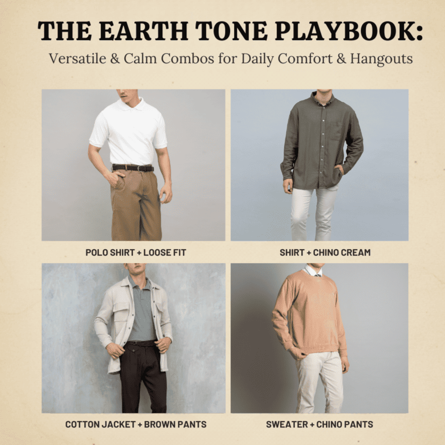 Earth tone jadi pilihan favorit karena warnanya natural, kalem, dan cocok untuk berbagai aktivitas mulai dari kuliah, kerja santai, sampai hangout. Beberapa kombinasi yang bisa dicoba: