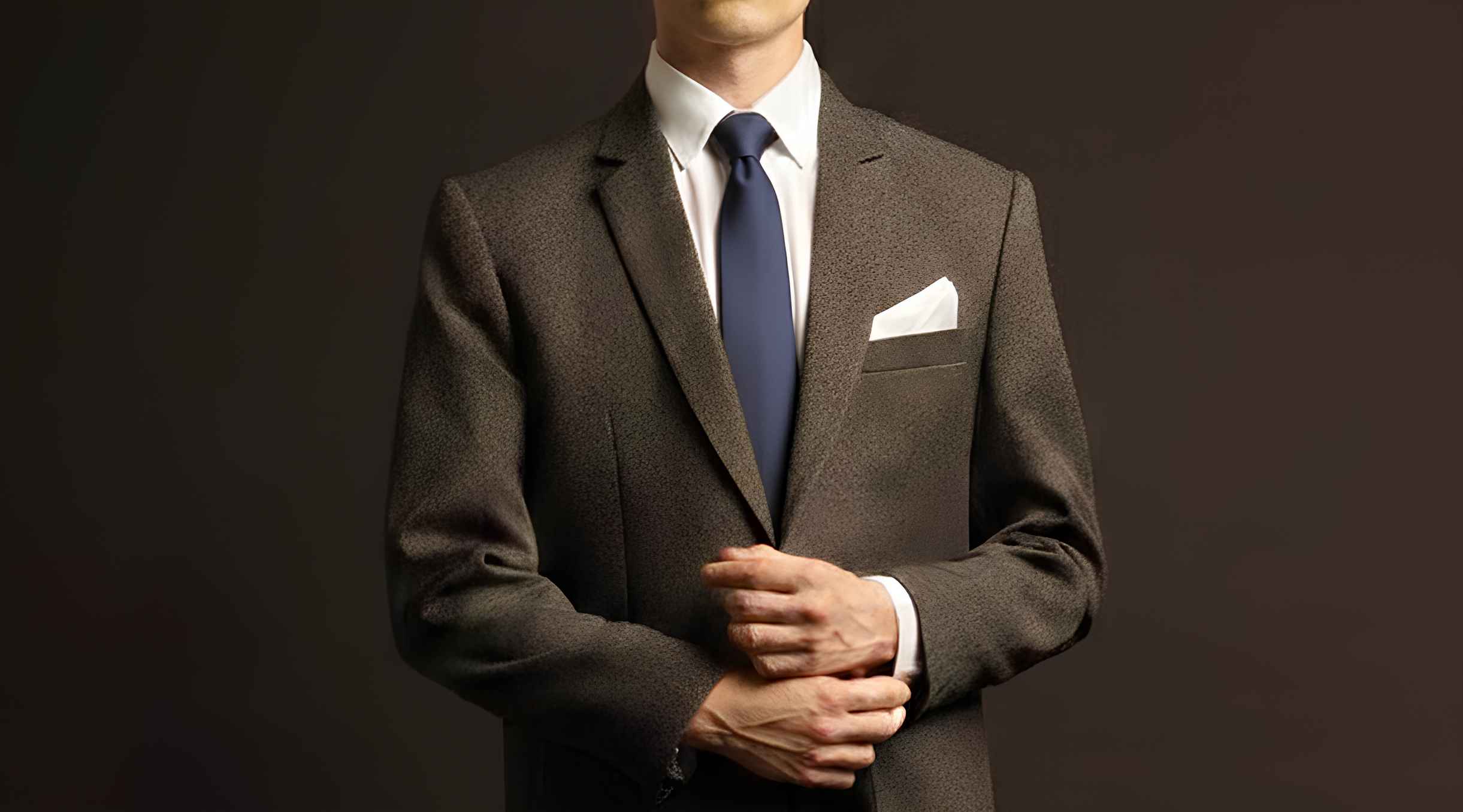 Navy membantu menyeimbangkan nuansa hangat dari jas earth tone. Hasilnya rapi tapi tetap stylish. Gunakan pocket square warna netral seperti hitam atau putih.