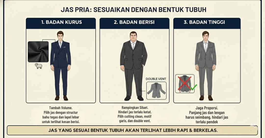 Jas yang sesuai bentuk tubuh akan terlihat lebih rapi tanpa dipaksakan.