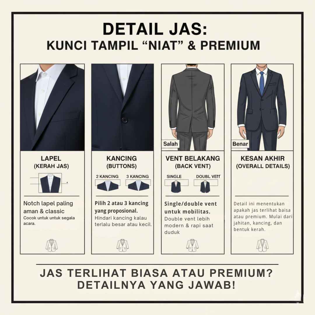 Detail ini menentukan apakah jas terlihat biasa atau premium.