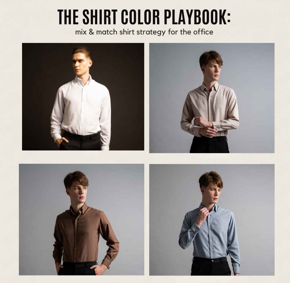 Warna kemeja netral seperti putih, biru muda, cream, dan coklat menjadi pilihan paling aman untuk outfit kantor karena cocok dengan berbagai warna celana dan jas.