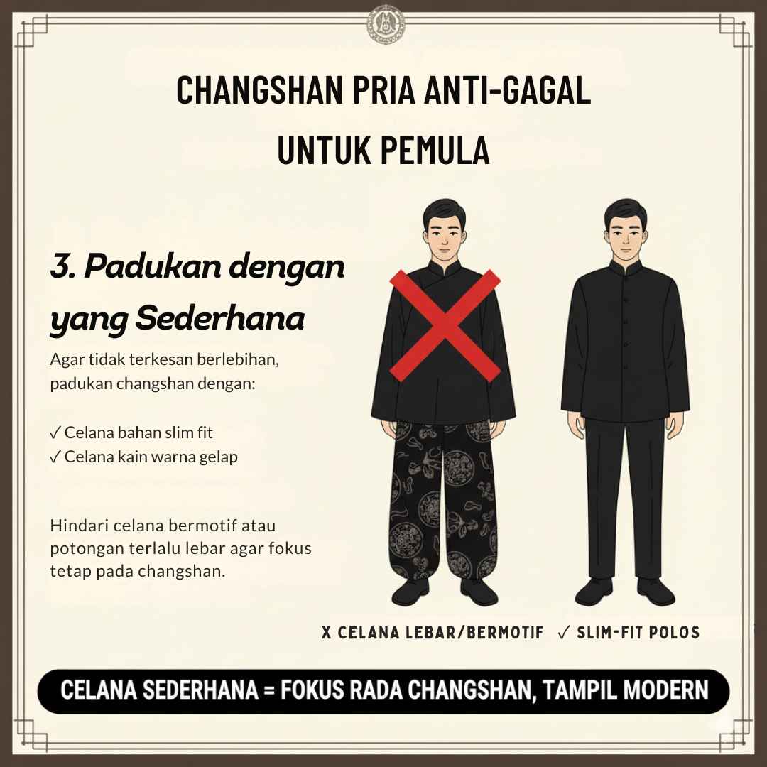Hindari celana dengan motif atau potongan terlalu lebar agar fokus tetap pada changshan.