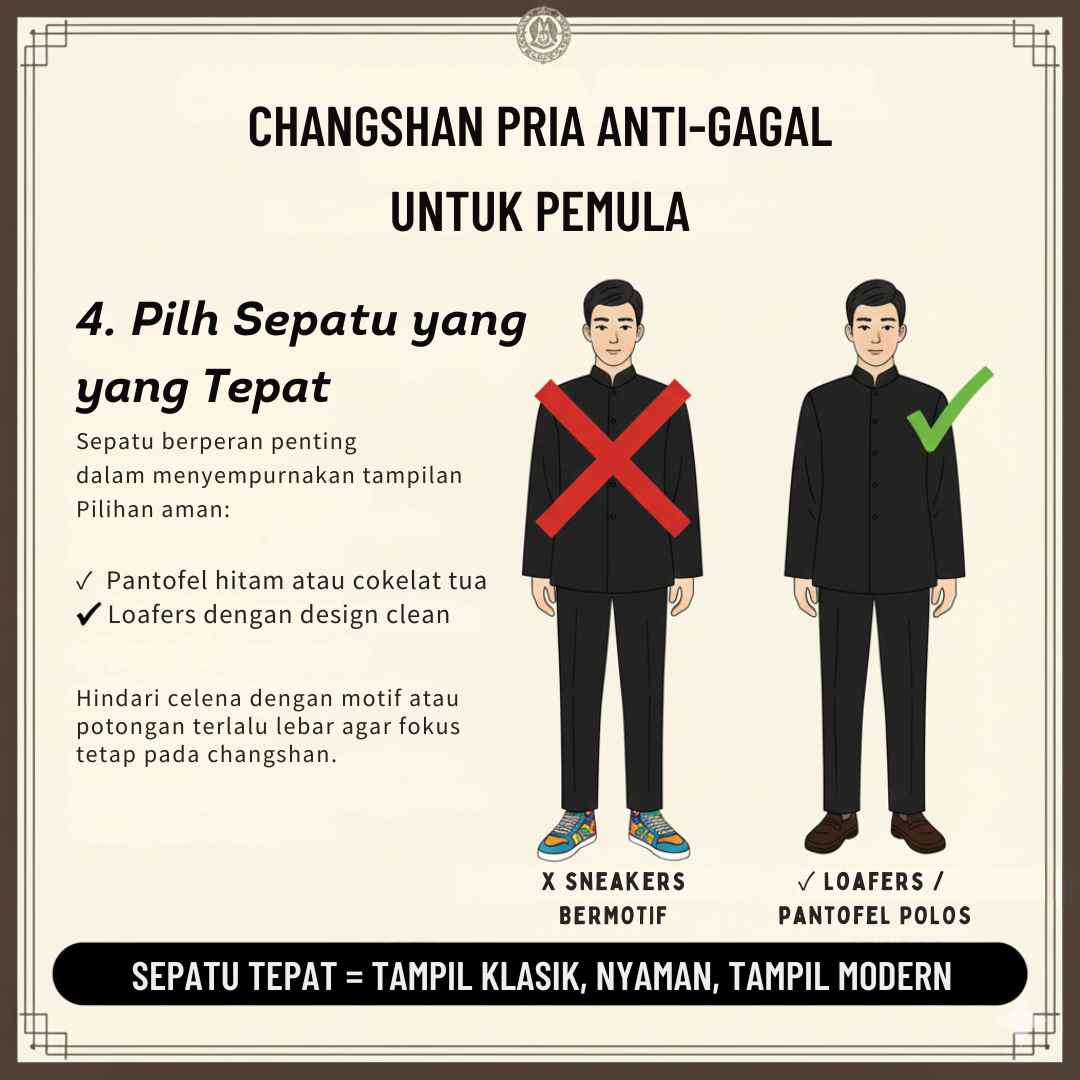 Sepatu berperan penting dalam menyempurnakan tampilan changshan. Pilihan aman: