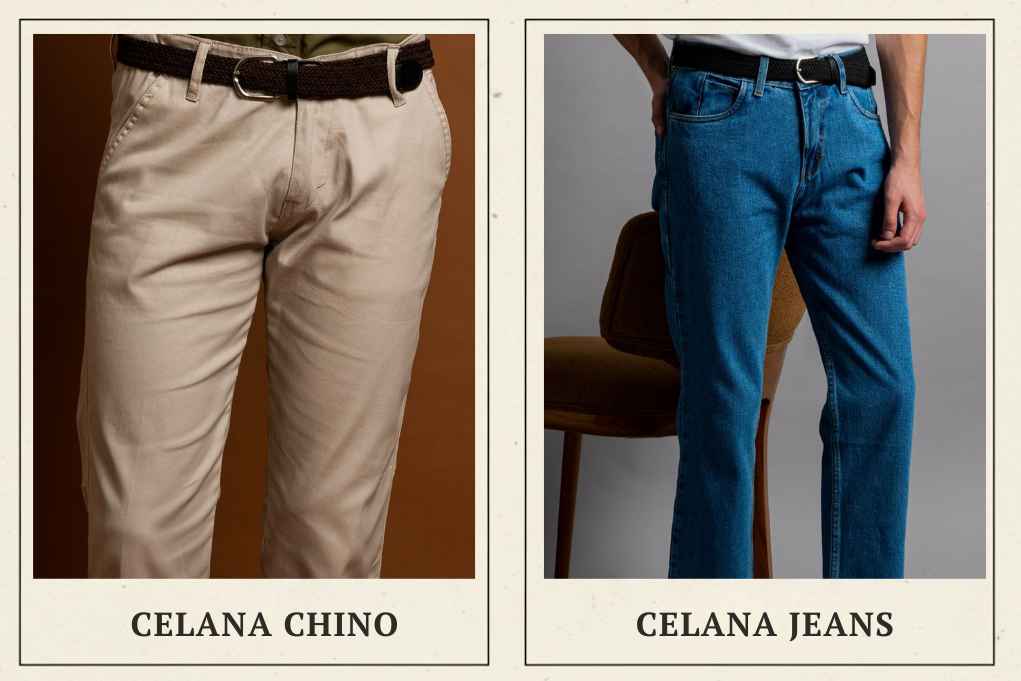 Bawahan memegang peran penting dalam kenyamanan outfit hangout pria. Jeans berwarna gelap cocok untuk tampilan kasual yang aman, sementara chino memberikan kesan lebih clean dan rapi.