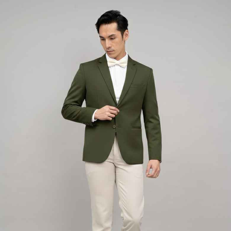 Kombinasi warna ini cocok untuk pria yang ingin tampil formal namun tidak terlalu kaku. Perpaduan hijau army–offwhite memberikan kesan modern tanpa menghilangkan kesan rapi.