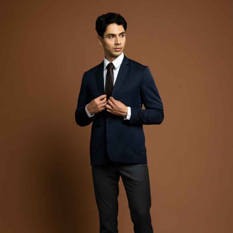 A: Jas navy dengan celana navy atau abu-abu adalah kombinasi paling aman dan fleksibel.