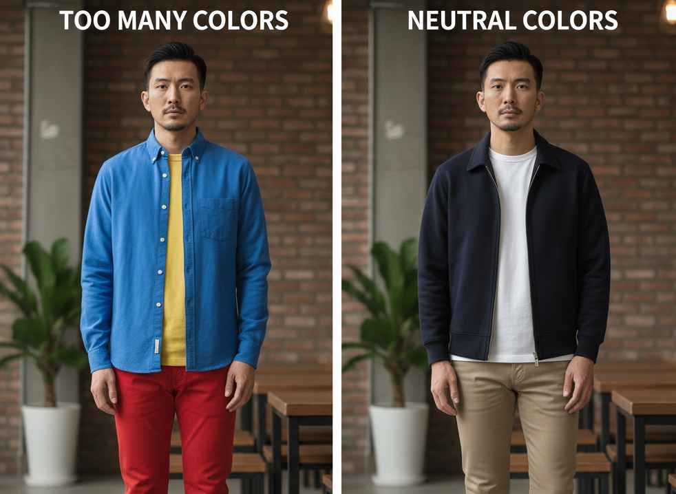 Banyak pria menggabungkan terlalu banyak warna mencolok dalam satu outfit casual. Hal ini membuat tampilan terlihat ramai dan kurang seimbang.