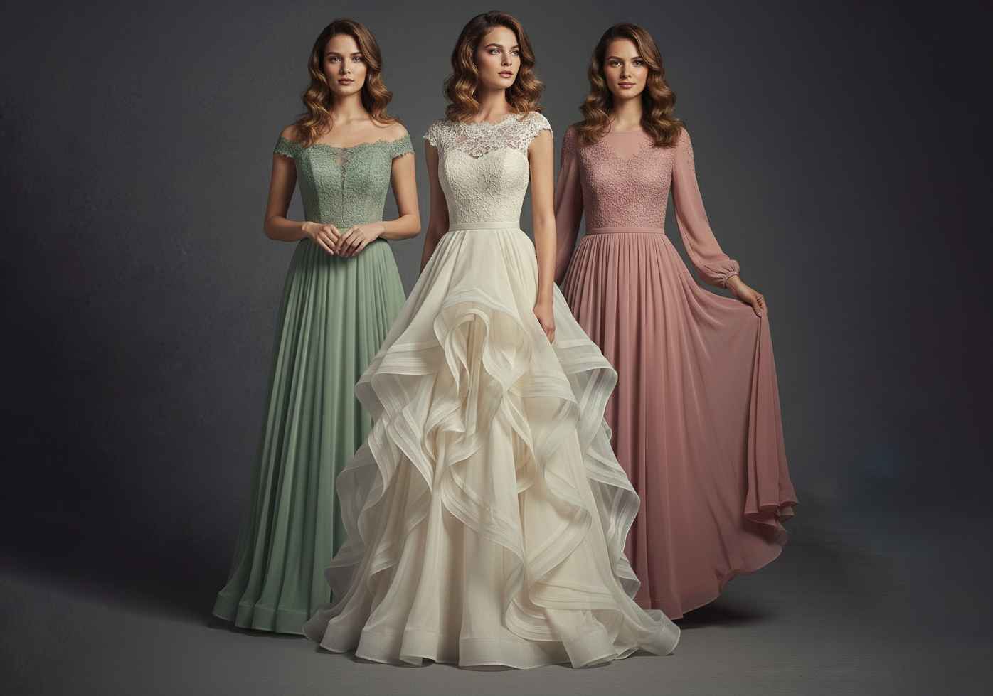 Gaun dengan warna soft dan earthy tone sangat cocok untuk acara resmi outdoor. Warna cream, champagne, sage green, dusty pink, atau pastel blue akan terlihat natural dan menyatu dengan suasana luar ruangan.