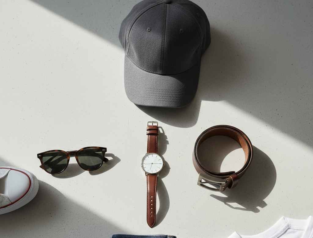Aksesori seperti jam tangan casual, belt kulit, atau topi dapat melengkapi outfit weekend pria. Gunakan secukupnya agar tampilan tetap clean dan tidak berlebihan.