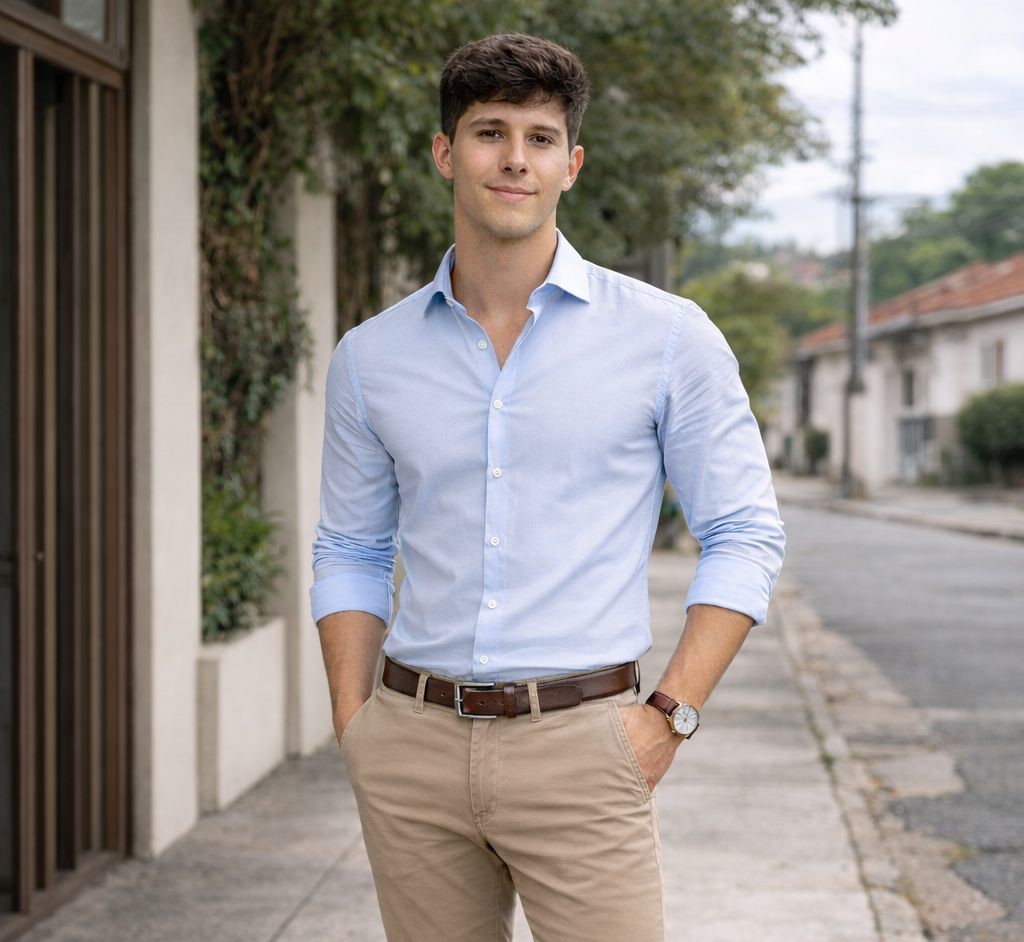 Kemeja cream + celana coklat muda + loafers dark brown → hangat dan classy.