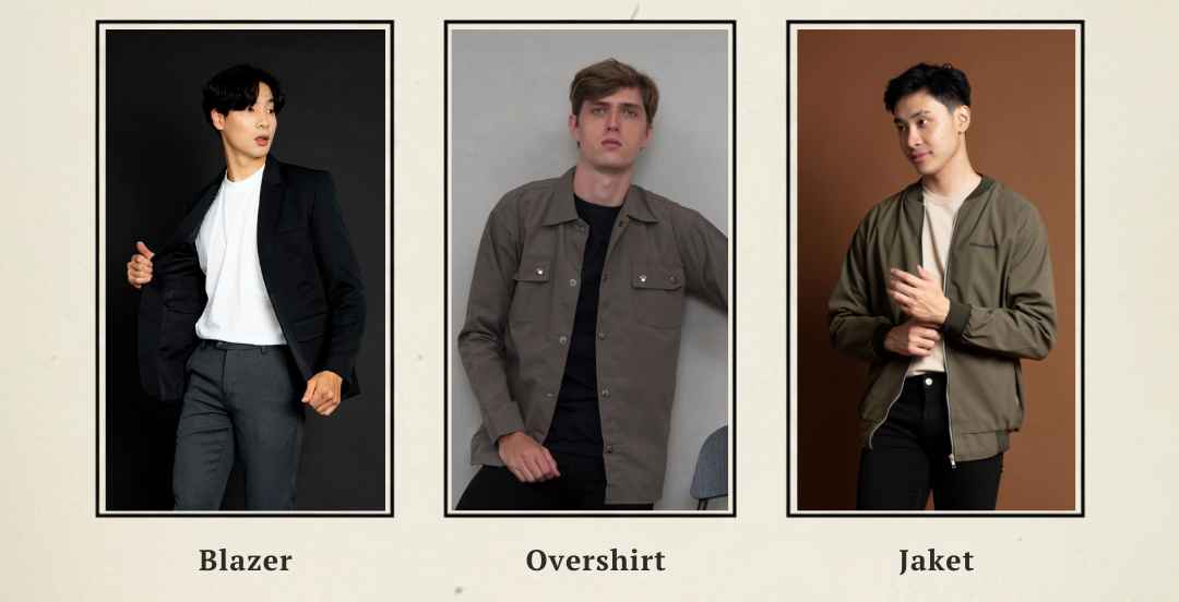 Blazer dengan potongan clean yang dipadukan kaos polos hitam dan celana chino memberikan kesan semi formal yang tetap modern. Overshirt olive di atas kaos putih tulang menciptakan kombinasi santai namun tetap terarah.