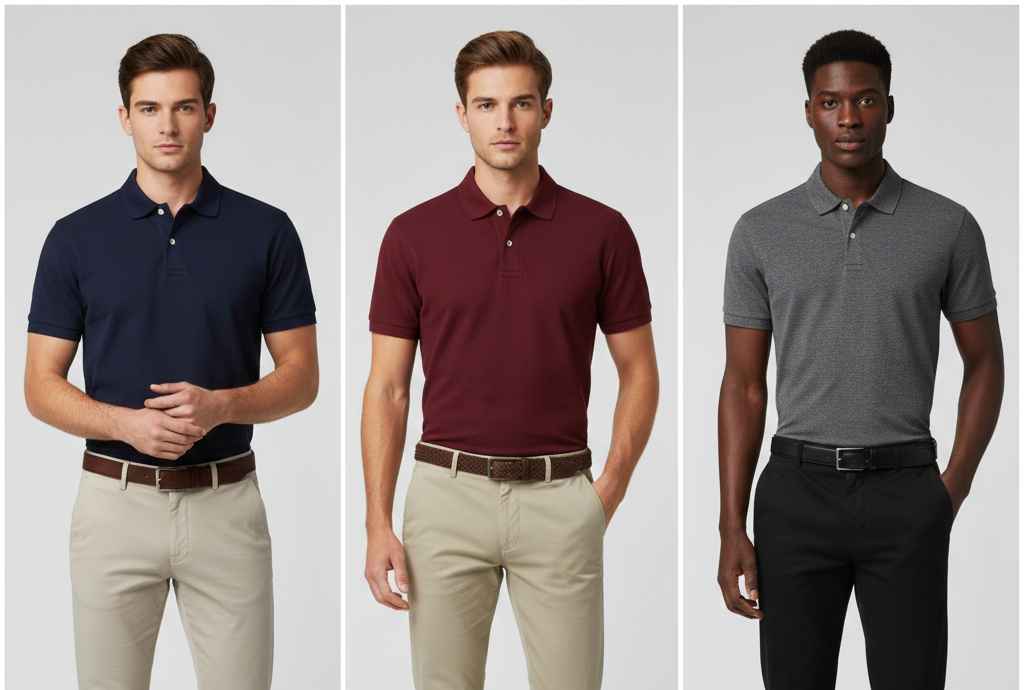 Polo shirt adalah upgrade dari kaos biasa. Kerahnya memberi struktur tambahan pada bagian atas tubuh sehingga siluet terlihat lebih tegas. Warna maroon, navy, atau charcoal membuat tampilan lebih dewasa dan maskulin.