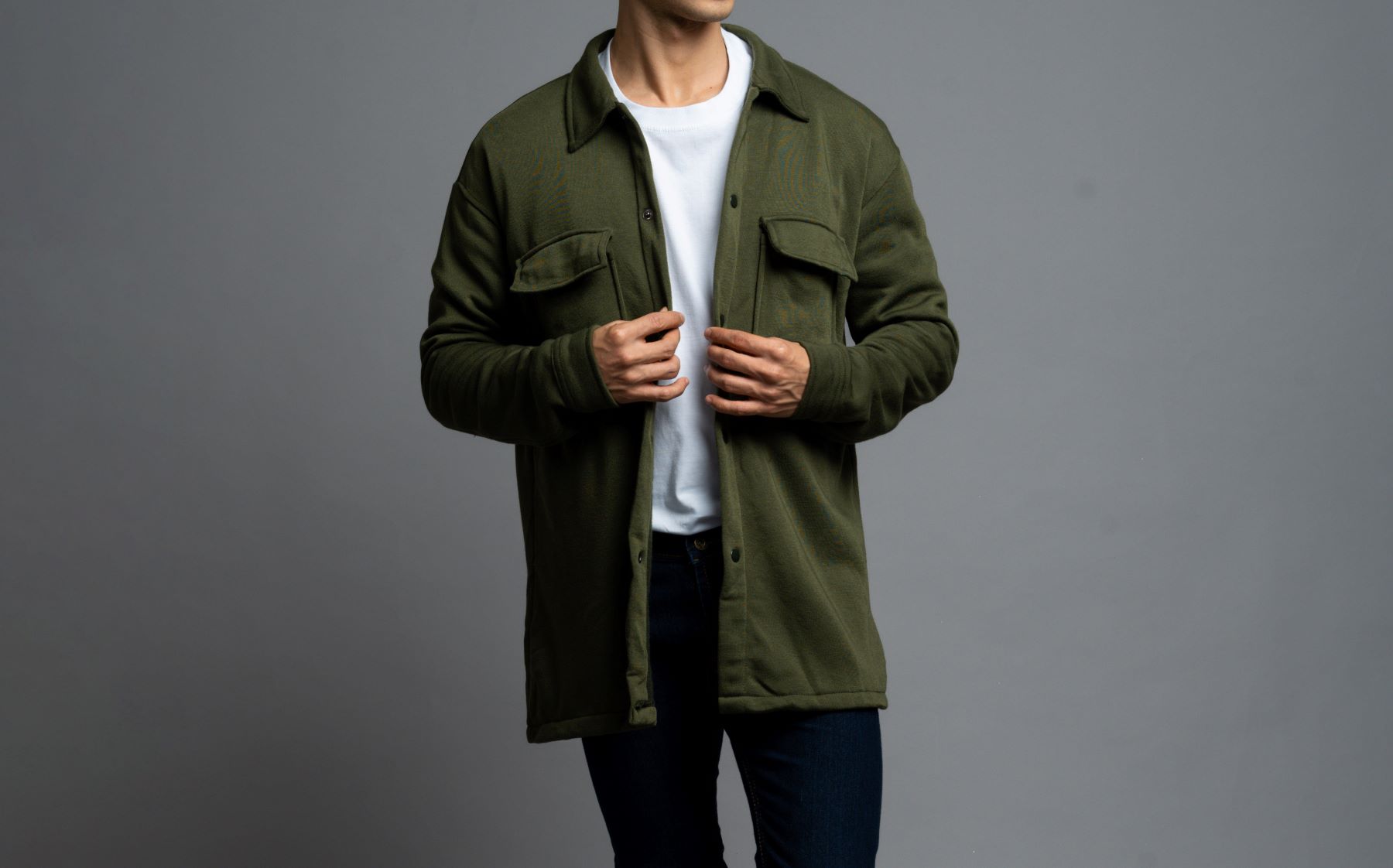 Overshirt juga menjadi tren outfit pria modern karena memberi tampilan layering yang clean. Dipakai di atas kaos polos dan dipadukan dengan denim akan menciptakan gaya yang terlihat effortless namun tetap berkarakter.