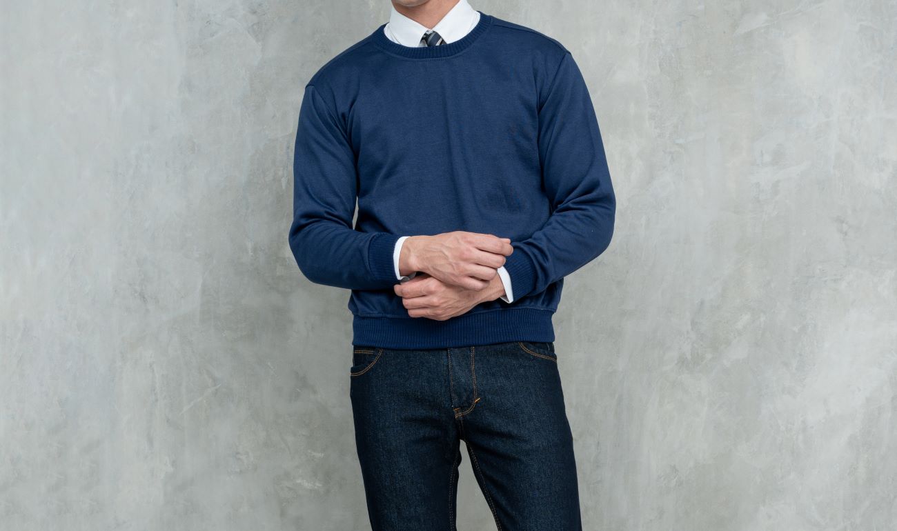 Sweater tipis atau knitwear dapat memberikan tampilan yang lebih clean dan modern, terutama jika dipadukan dengan denim warna gelap. Kombinasi ini sering digunakan untuk gaya smart casual karena memberi kesan rapi tanpa terlihat kaku.