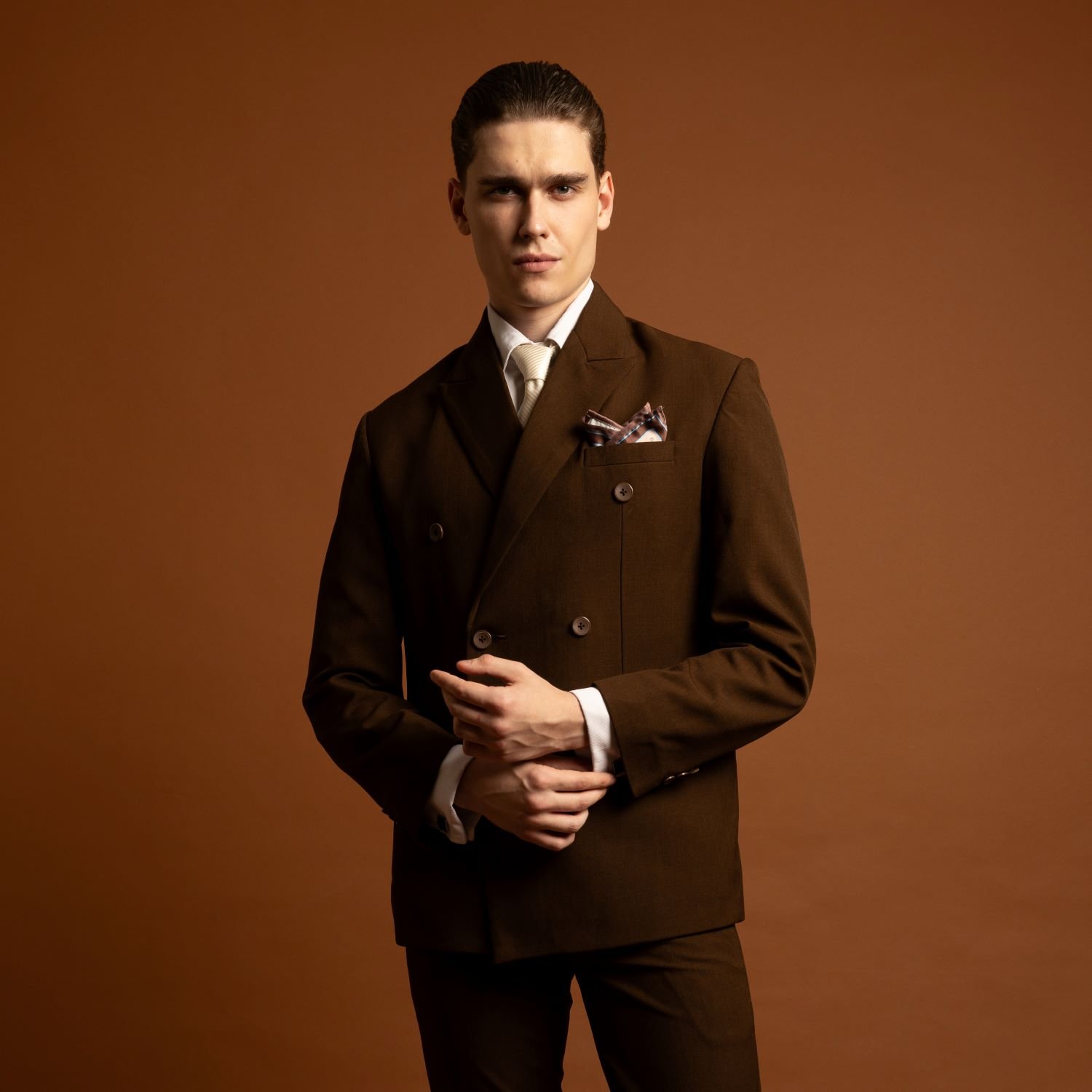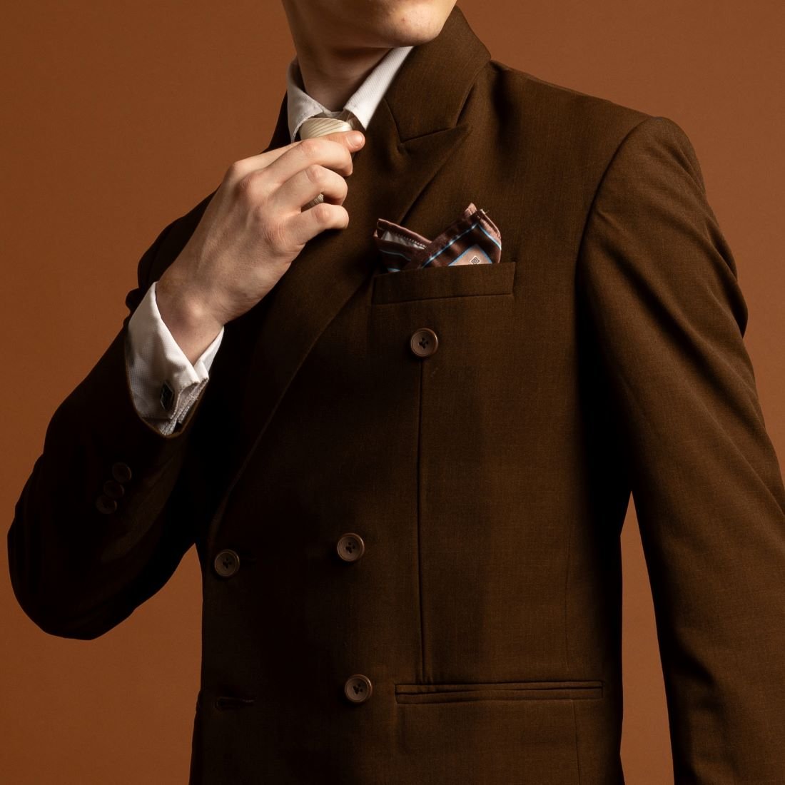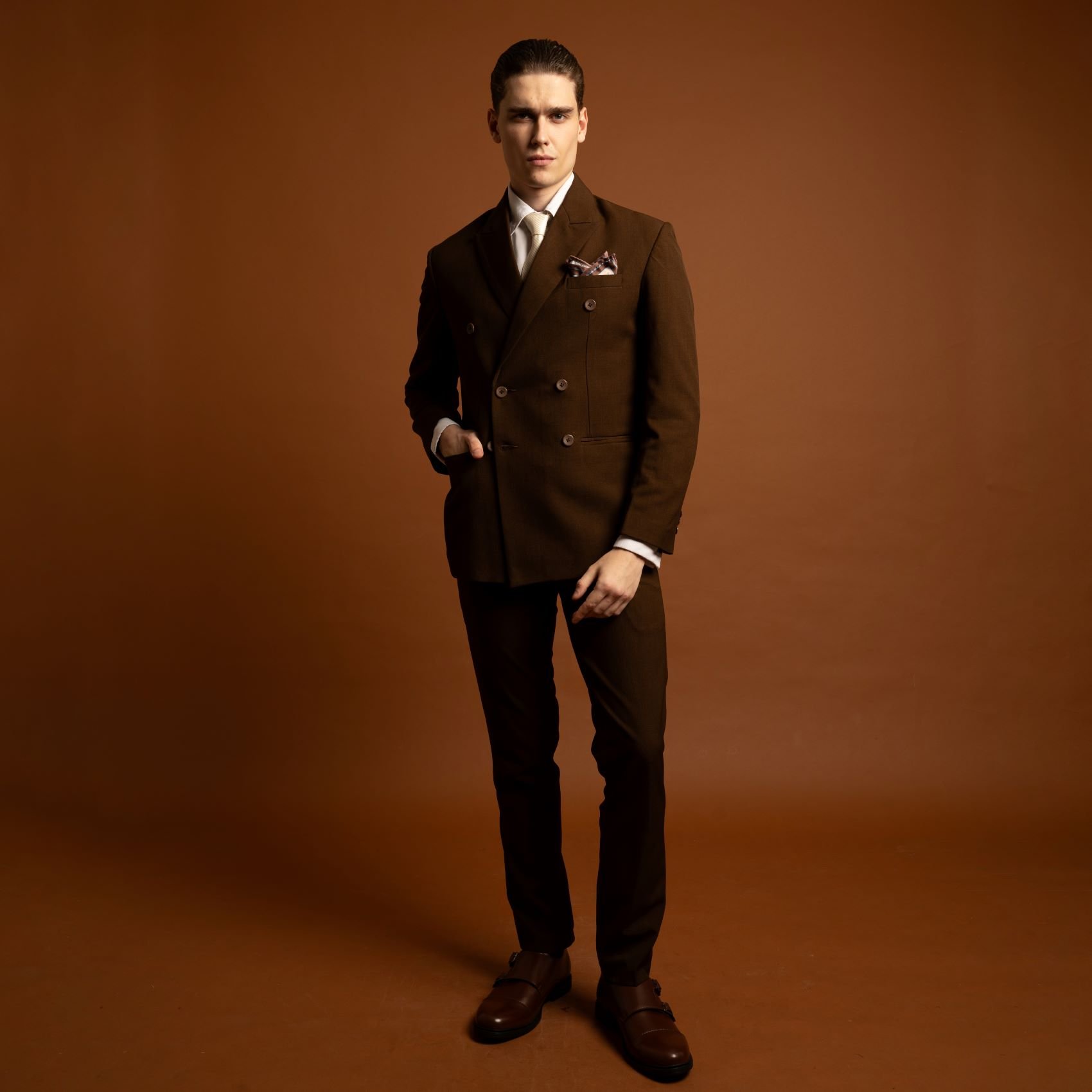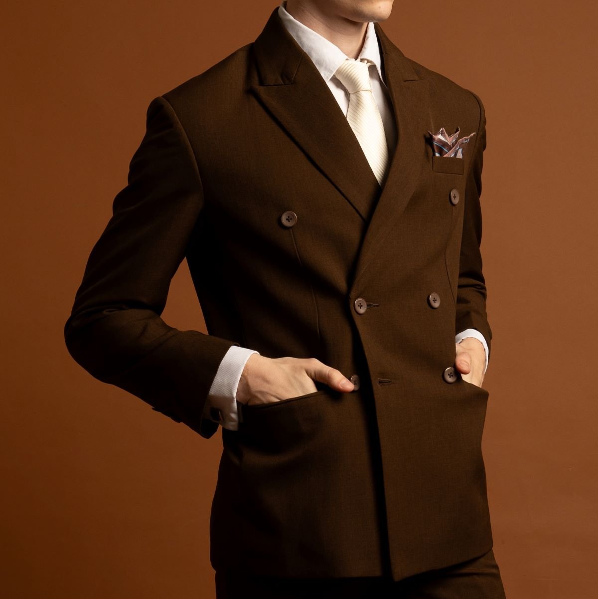 Jas coklat double breasted menghadirkan kesan hangat, elegan, dan berkarakter dengan siluet tegas dari desain kancing ganda. Warna earthy yang modern membuatnya cocok untuk wedding, engagement, maupun acara formal dengan konsep indoor maupun outdoor.