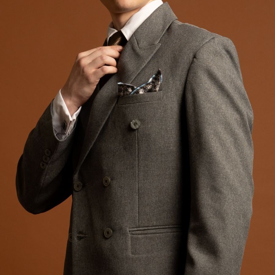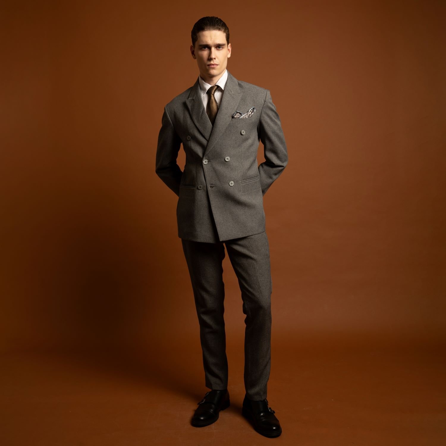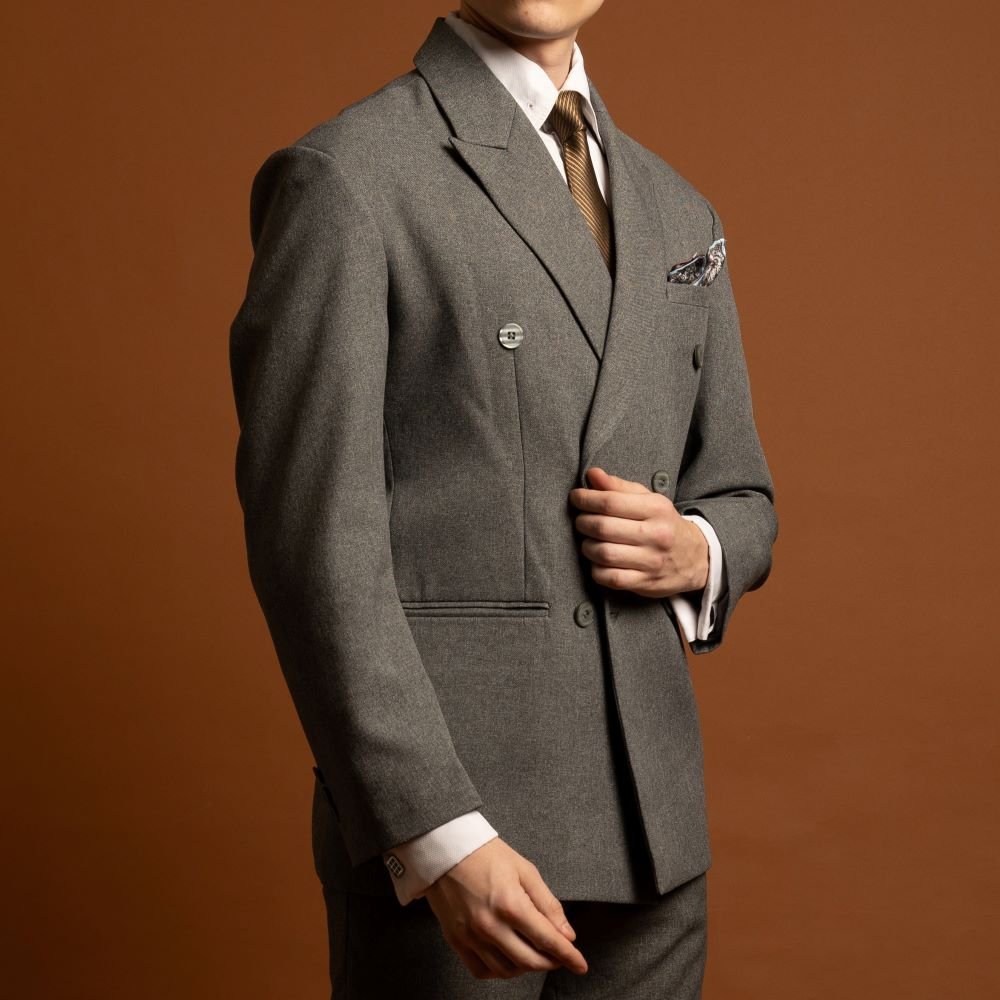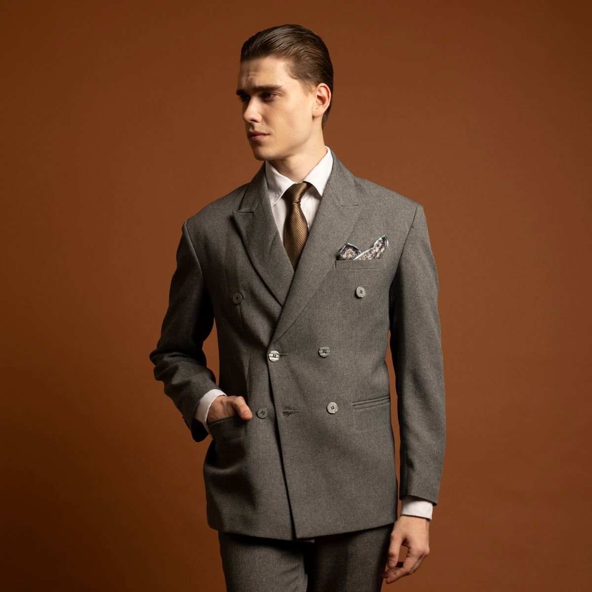 Jas light grey double breasted menghadirkan tampilan formal yang modern dan elegan dengan siluet tegas dari desain kancing ganda. Warna abu-abu terang memberi kesan fresh dan refined, cocok untuk wedding, acara resmi, maupun event siang hari.