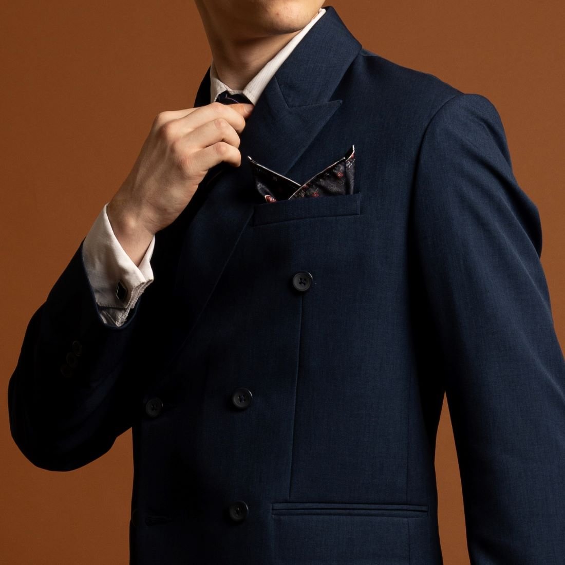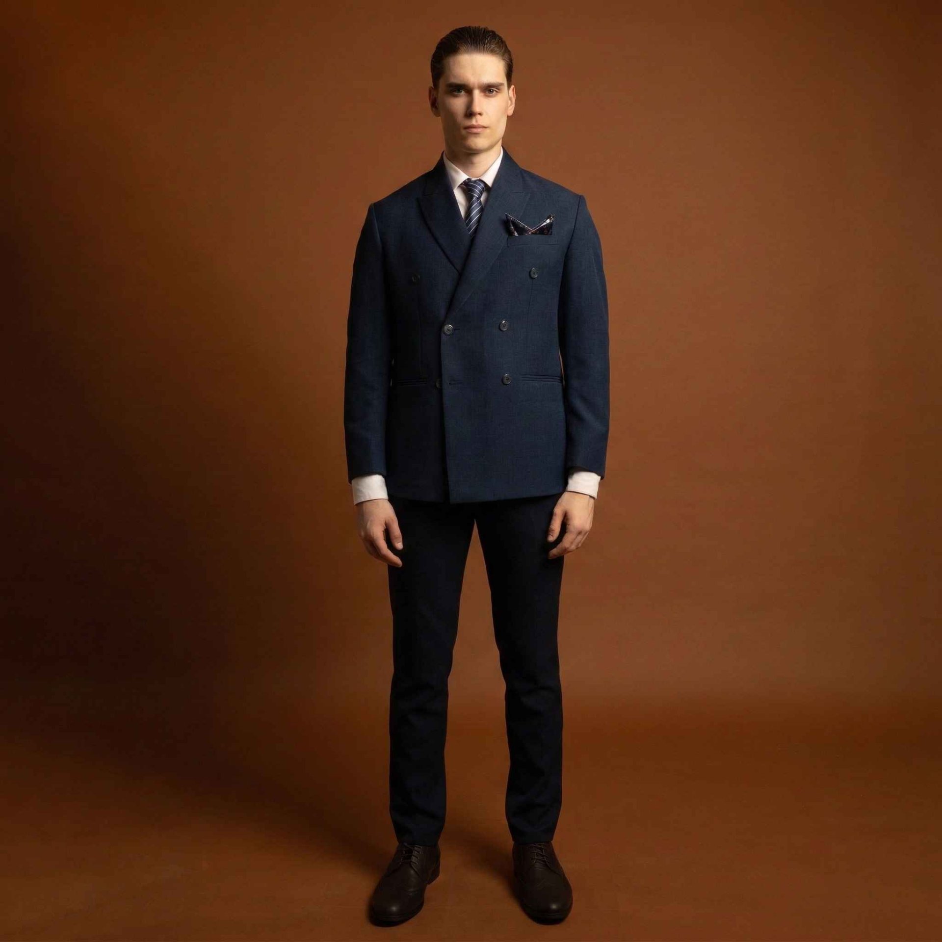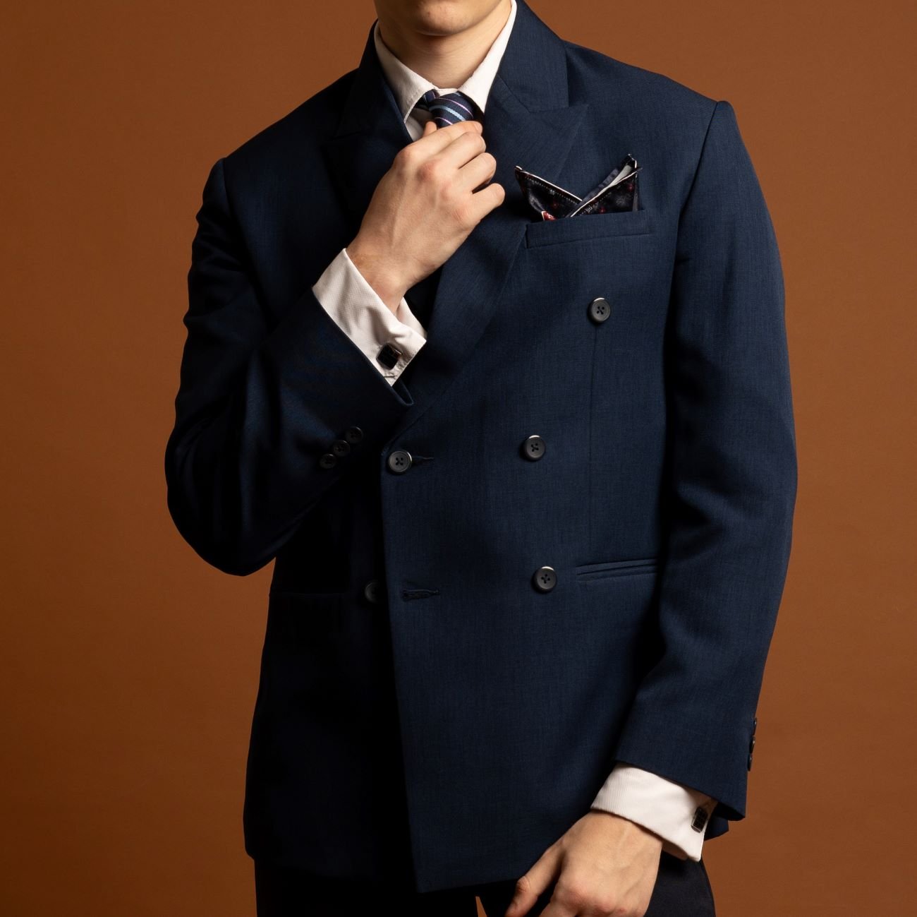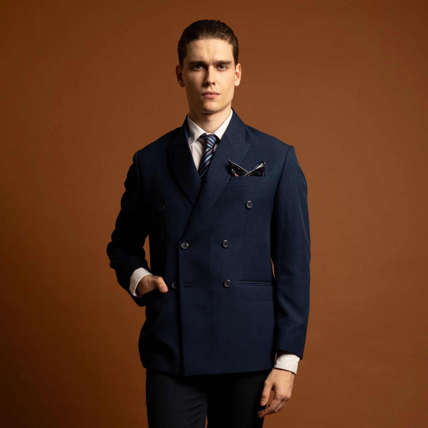 Jas navy double breasted menghadirkan siluet tegas dan tampilan yang lebih powerful. Detail kancing ganda memberi kesan klasik, elegan, dan berwibawa, cocok untuk acara formal, wedding, maupun kebutuhan profesional.