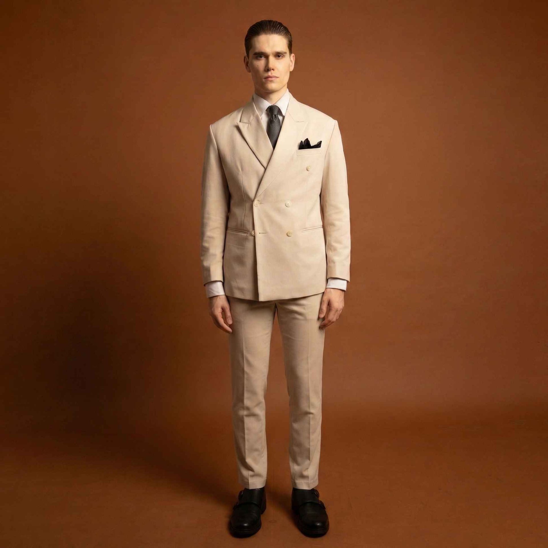Jas offwhite double breasted menghadirkan tampilan clean, elegan, dan standout dengan siluet tegas berkat desain kancing ganda. Warna terang yang eksklusif membuatnya cocok untuk wedding, engagement, maupun acara formal dengan konsep modern.